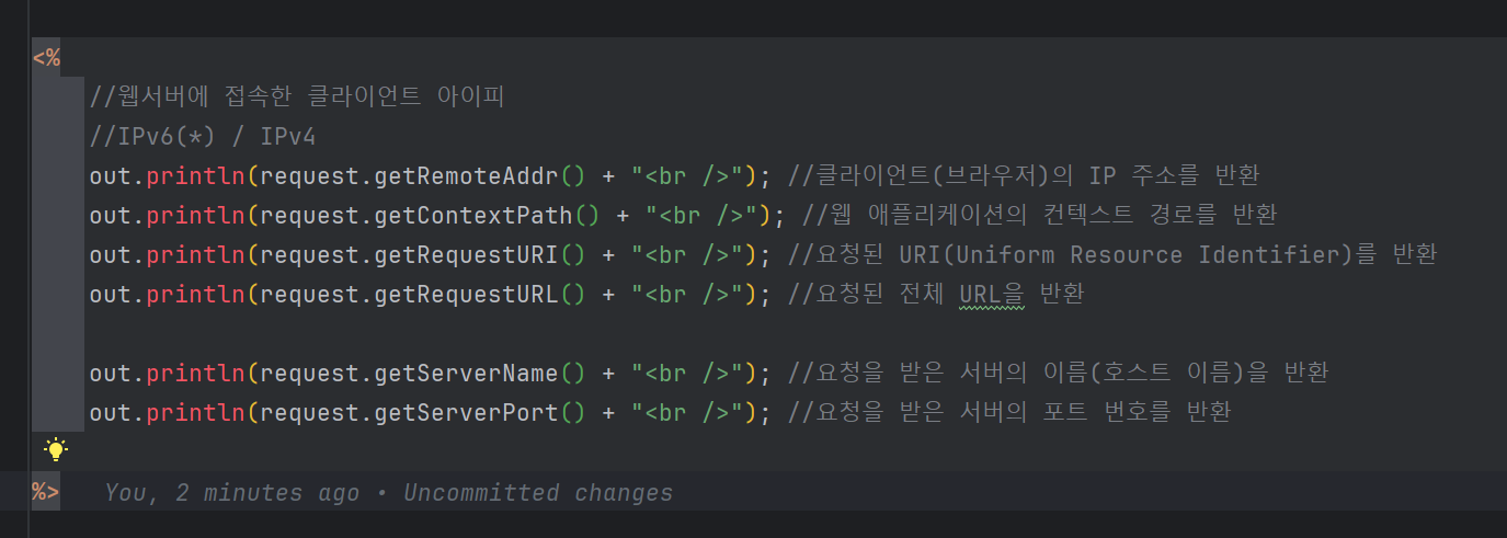 <p>사용자 이름: <%= request.getParameter("username") %></p>- getParameter(String name) : 요청 파라미터 값을 반환